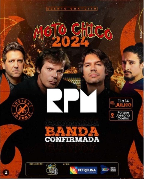 Convidamos a todos a participarem do Moto Chico, que irá ofertar uma programação multicultural diversificada, com atrações musicais e exposição de motos e estandes temáticas. A banda RPM será a principal atração, que também recebe bandas locais como Dubaia, MPA e Semivelhos. O evento reúne motociclistas de várias partes do Brasil.