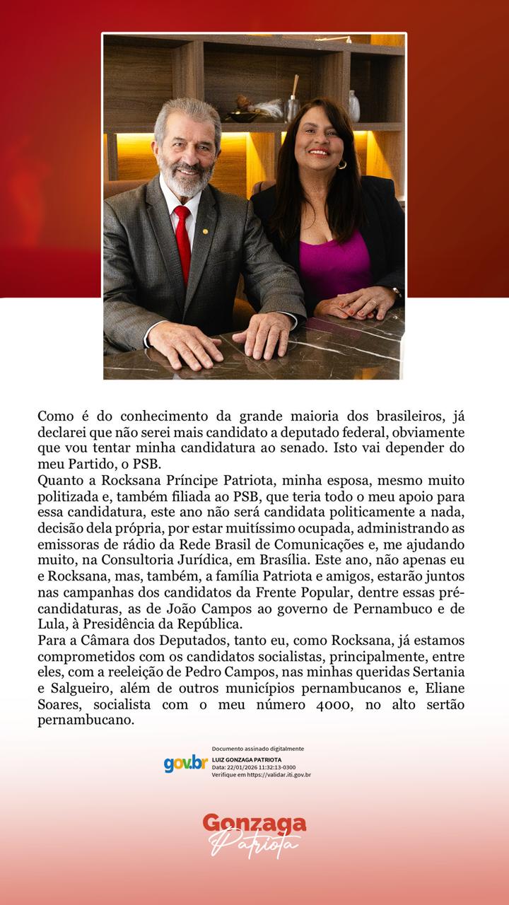 O ex-deputado Gonzaga Patriota (PSB) mantém firme a ideia de disputar uma vaga para o Senado Federal. Em nota, o ex-parlamentar reafirma compromisso com candidatos do seu partido, o PSB, e da Frente Popular de Pernambuco, em especial com as pré-candidaturas de reeleição de Lula para presidente da República, João Campos para o governo de Pernambuco e a reeleição de Pedro Campos para deputado federal.