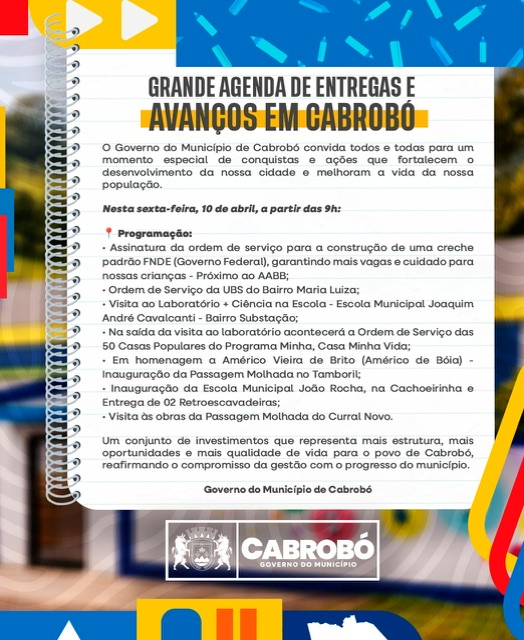 A Prefeitura de Cabrobó divulgou uma ampla agenda de ações e investimentos que serão realizados nesta sexta-feira, 10 de abril, a partir das 9h, marcando um importante momento de desenvolvimento e melhorias para a cidade.