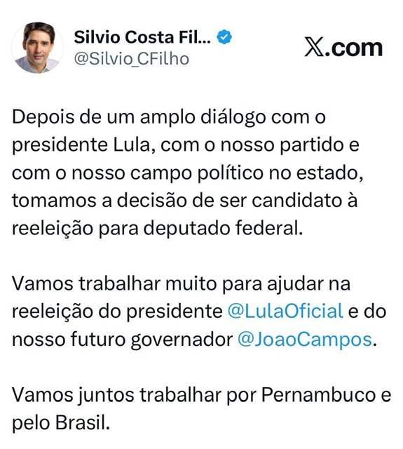 O ministro de Portos e Aeroportos, Silvio Costa Filho, anunciou que será candidato à reeleição para deputado federal nas eleições de 2026. A declaração foi feita por meio de publicação nas redes sociais, após, segundo ele, diálogo com o presidente Lula, seu partido e lideranças políticas em Pernambuco.