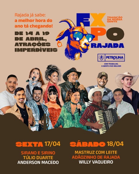 A Prefeitura de Petrolina divulgou a programação da ExpoRajada 2026, evento tradicional que movimenta o distrito de Rajada e reforça o calendário cultural da zona rural do município. A feira acontecerá de 14 a 19 de abril, enquanto os shows serão realizados nos dias 17 e 18, com artistas consagrados do forró e valorização de talentos locais.