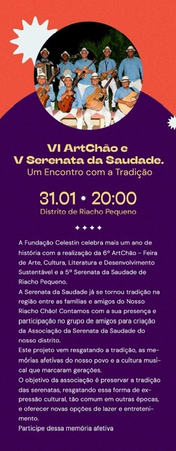A Fundação Celestin realizará a VI Feira de Arte, Cultura, Literatura e Desenvolvimento Sustentável; nos dias 30/01 (sexta), 31/01 (sábado) e 01/02/2026 (domingo).